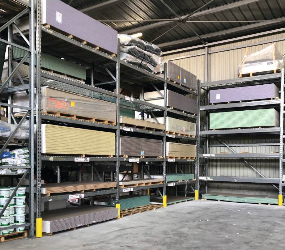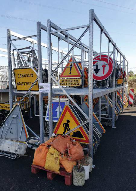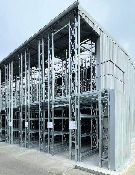 Outdoor pallet racking with canopy, rear and side cladding for weather protection. Rainwater evacuation system. Ideal for lumber yards, materials yards, and outdoor storage.